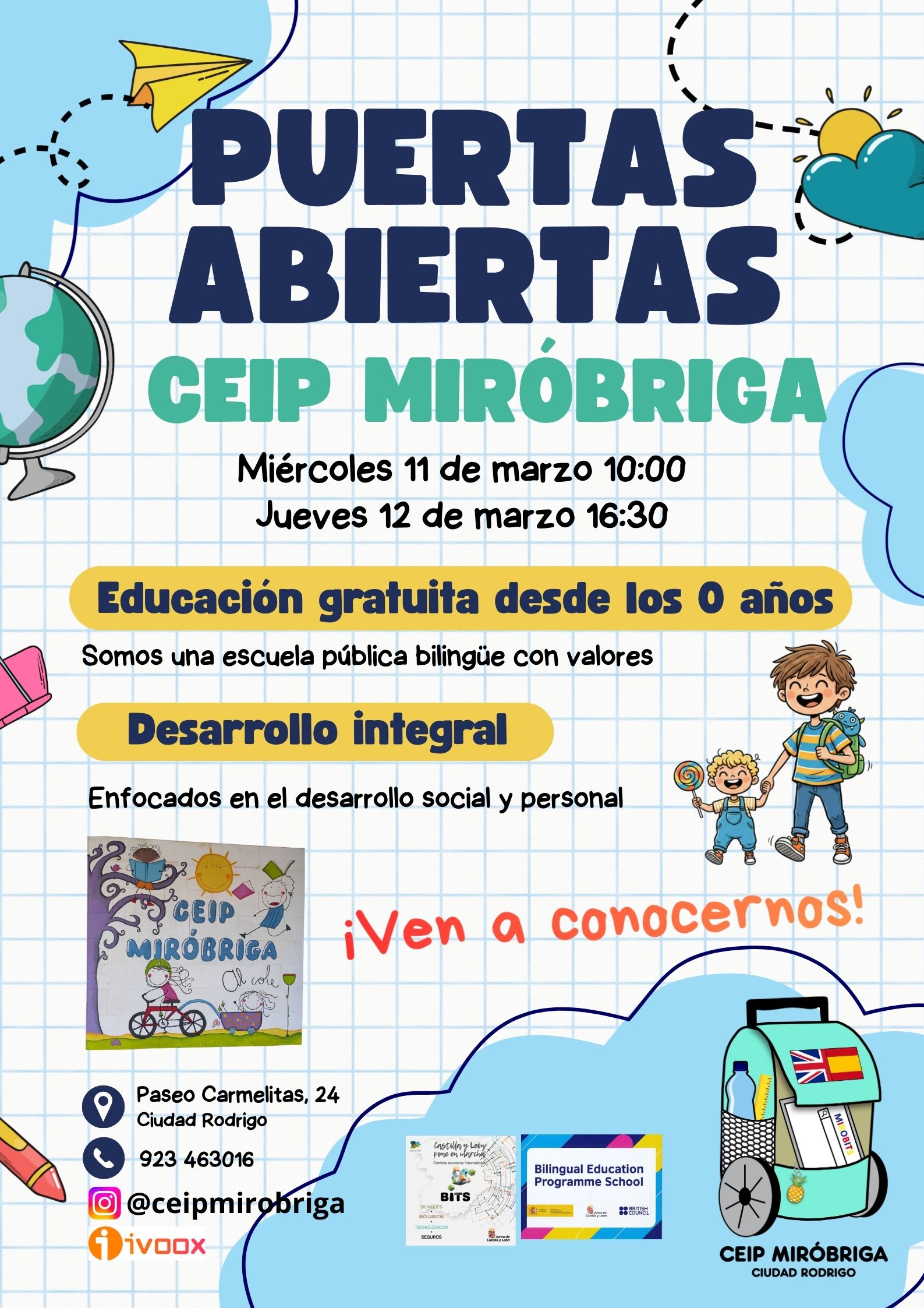 Somos un centro educativo de titularidad pública, innovador, inclusivo y bilingüe, bajo el convenio MEFP-British Council y perteneciente a la red de centros BITS.Nos encontramos en la bonita localidad de Ciudad Rodrigo, en Salamanca.Puedes contactar con nosotros a través del formulario de contacto, del correo electrónico del centro o de los teléfonos del mismo.Síguenos en X - Twitter y en Instagram @ceipmirobriga, y apóyanos con los hastags #somosunapiña y #mirobits |
